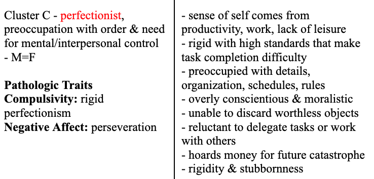 Describe the etiology & presentation of obsessive compulsive personality disorder