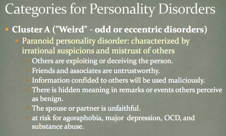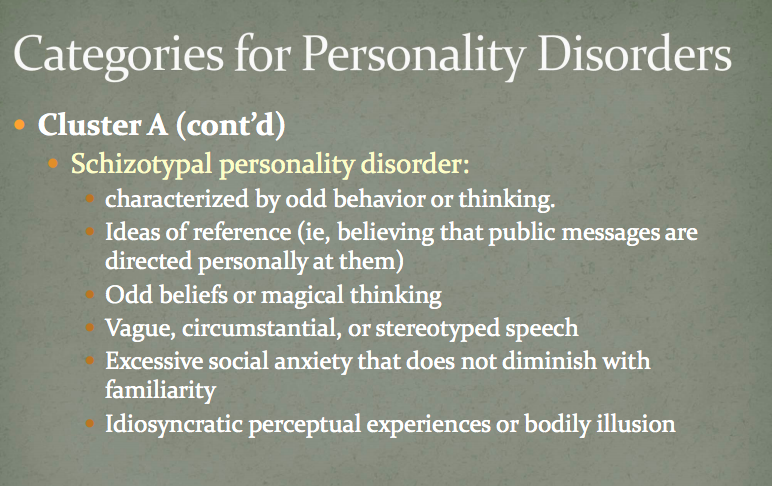 What are the characteristics of Schizotypal personality disorder (cluster A)?
