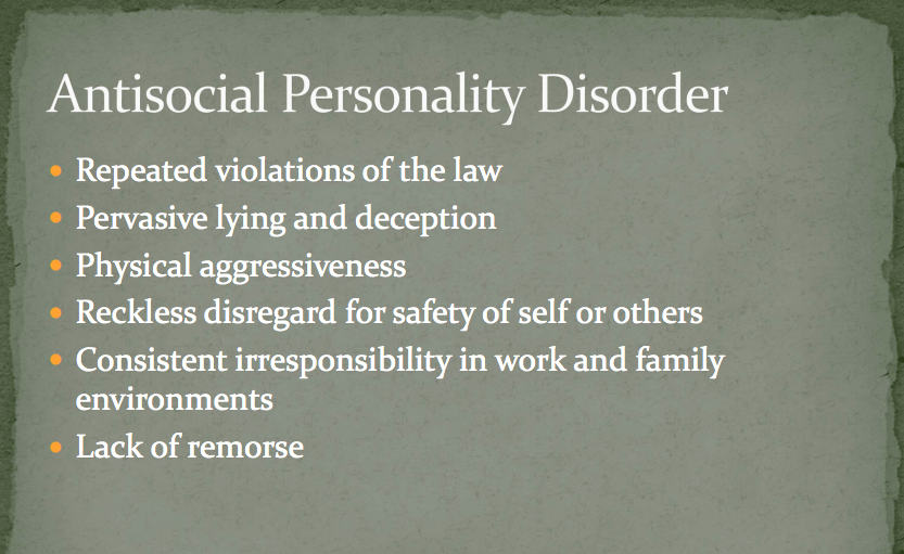 Which personality disorder is characterized by repeated violations of the law, pervasive lying and deception, physical aggressiveness, reckless disregard for safety of self or others, irresponsibility, and lack or remorse?