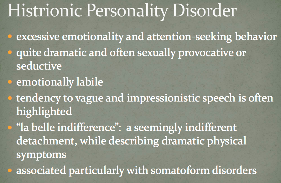 Which personality disorder is characterized by attention-seeking, dramatic speech and emotional exprssion, shallow and labile emotions, and sexual provocativity?