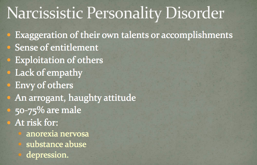 Pt’s with Narcissistic personality disorder are at risk for what 3 co-morbidities?