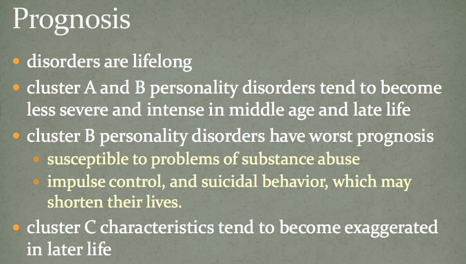 Which clusters of personality disorders tend to become less severe and intense in middle age-late life and which tends to become more exaggerated?