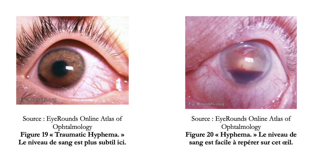 Le terme hyphéma implique la présence de sang dans la chambre antérieure.