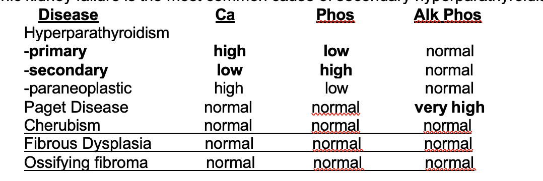 In secondary hyperparathyroidism, what is the calcium, phosphate & all phos labs look like