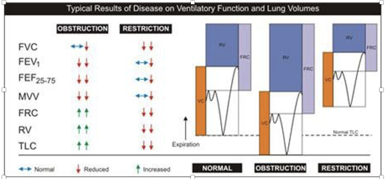 Obstructive = decreased FEV1/FVC. Increased residual volume, functional residual capacity, and (?) tidal volume. Restrictive/Obesity = normal to increased FEV1/FVC ratio. Decreased TLC, RFC, and RV.