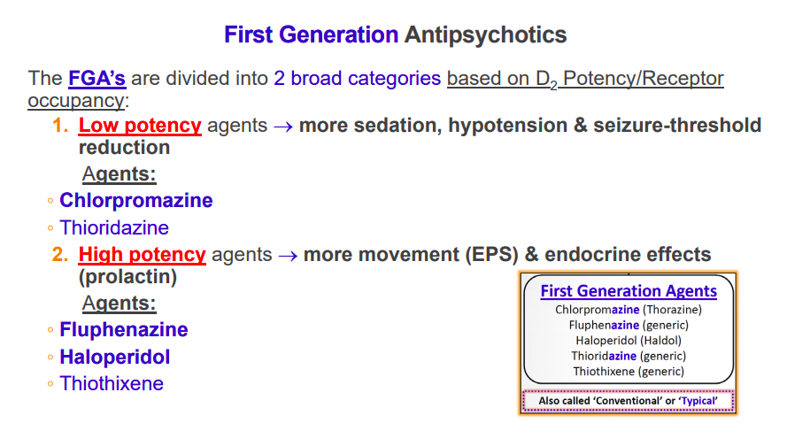 What are the 2 low-potency first gen. antipsychotic agents and what AE’s are they more associated with?