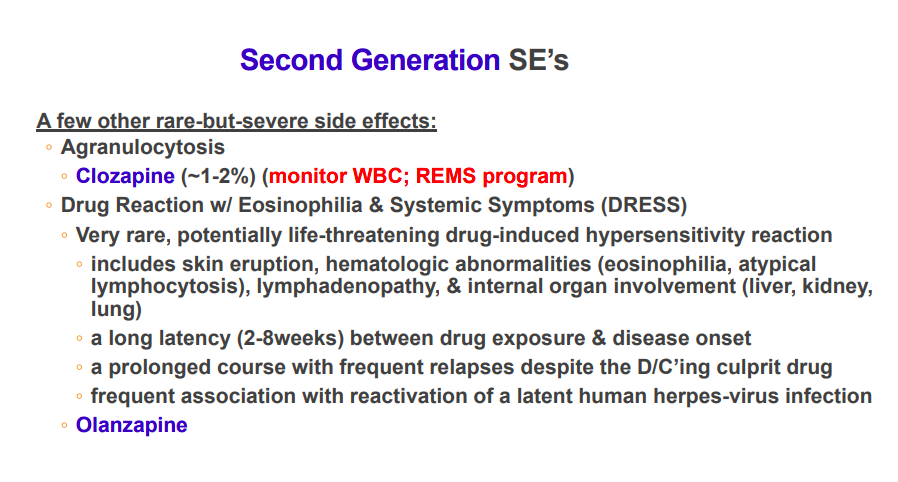 What are some of the rare AE’s associated with the first and second gen. antipsychotics?