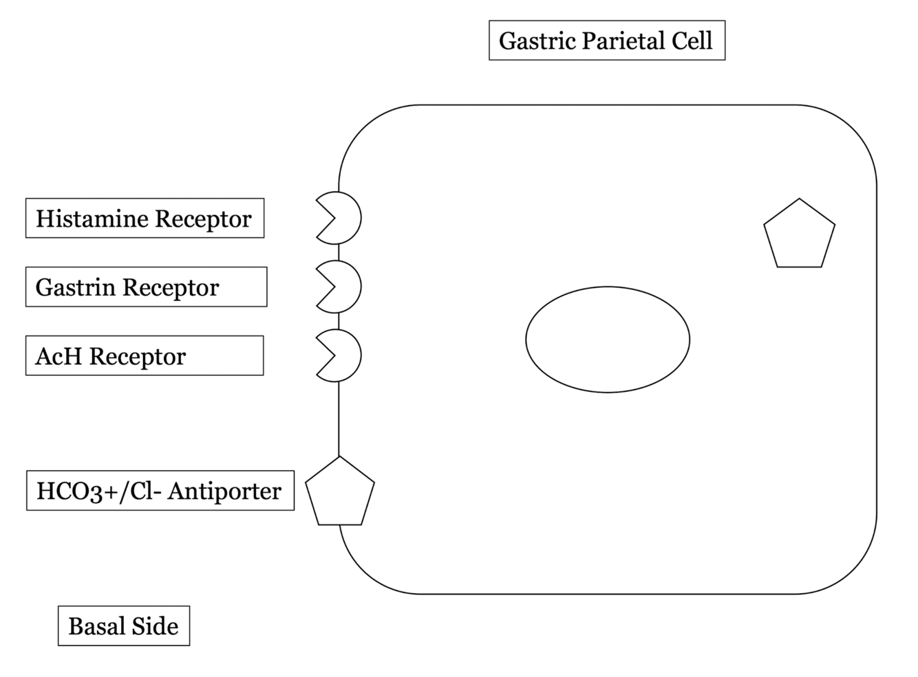 Histamine, gastrin, AcH; HCO3+/Cl- antiporter