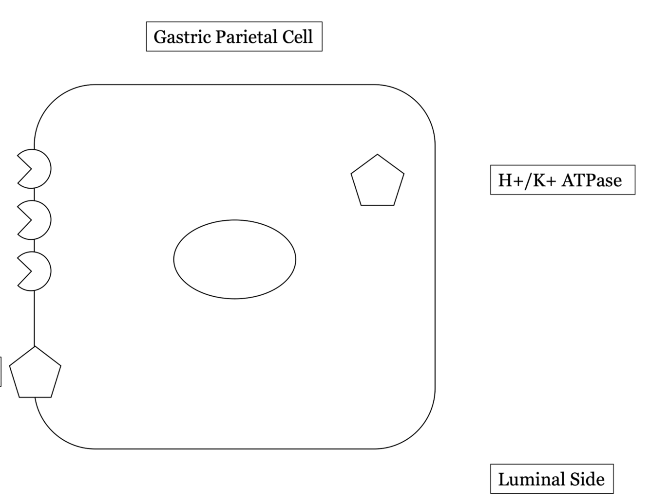 H+/K+ ATPase pump (in most animals, is inactive inside the parietal cell)