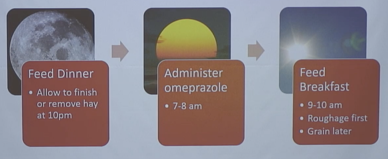 All-hay diets blunt effects of omeprazole (during tx) but are recommended in horses with hx ulcers (prevention– want hay in the stomach as a buffer)