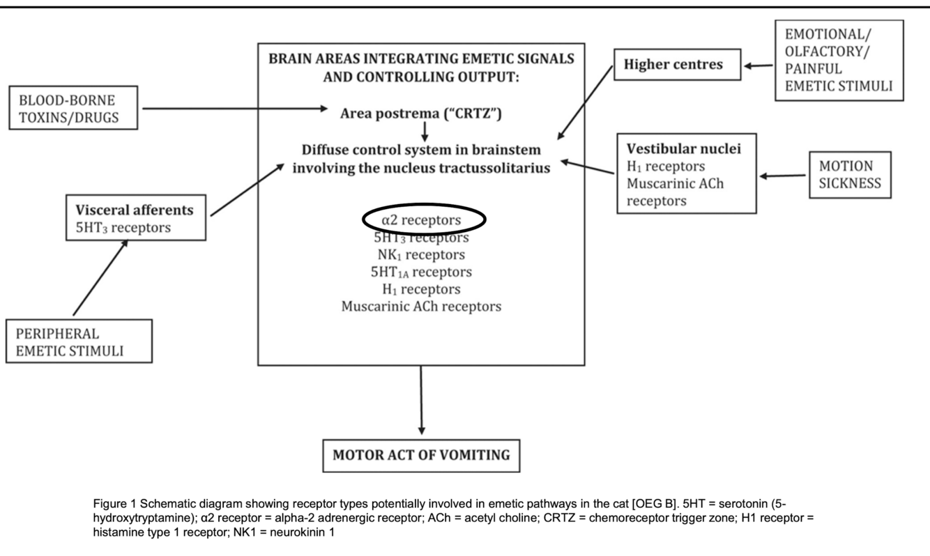 Alpha-2 agonists (cats have more alpha-2 receptors in CRTZ. dogs have more dopamine receptors).