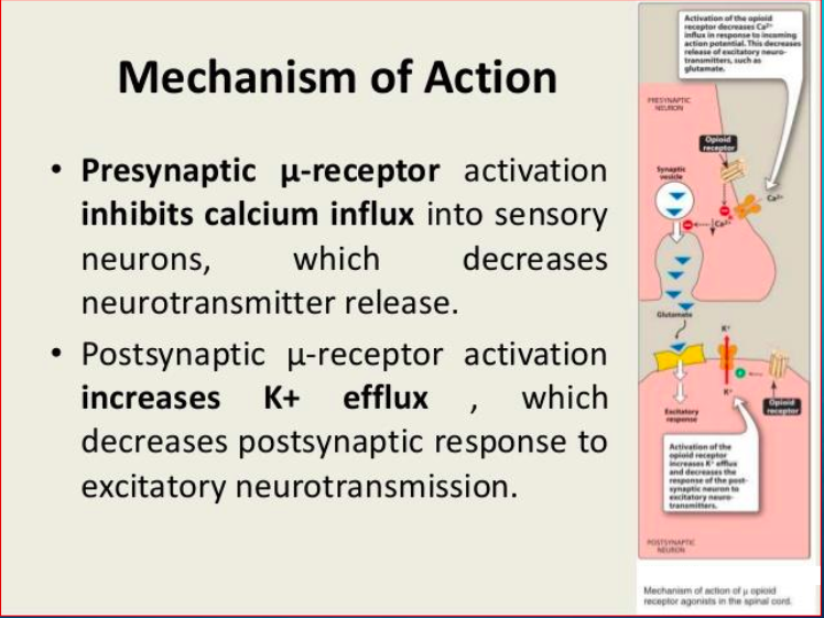 What is the MOA on both the presynaptic μ-receptor and post-synaptic μ-receptor by opioids?