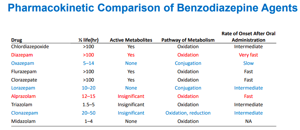 How does Diazepam differ from Alprazolam in terms of half-life, active metabolites and rate of onset?