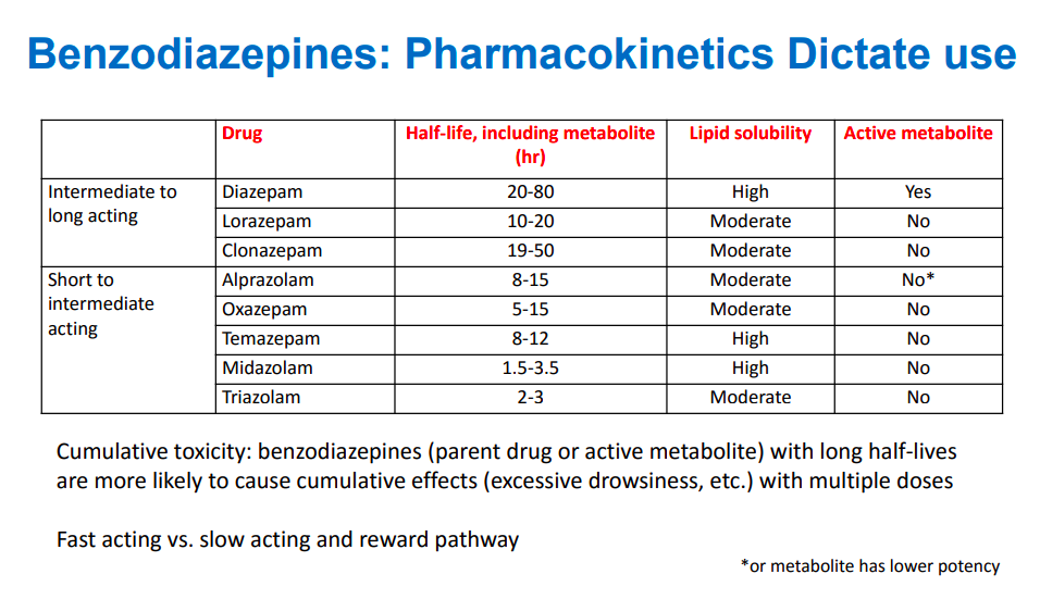 Which benzodiazepine has a short half-life (5-14 hr), no active metabolite, and the slowest rate of onset?