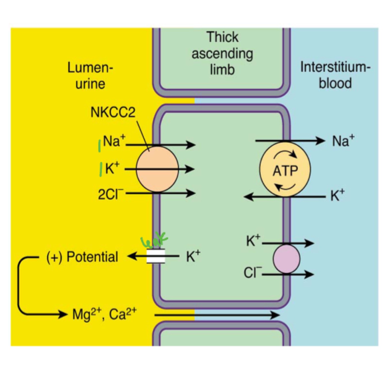 Na+/K+ ATPase pumping Na+ OUT of the Thick ascending limb