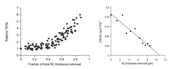 Explain the relationship between TransEpidermal Water Loss (TEWL) and the size of the stratum corneum