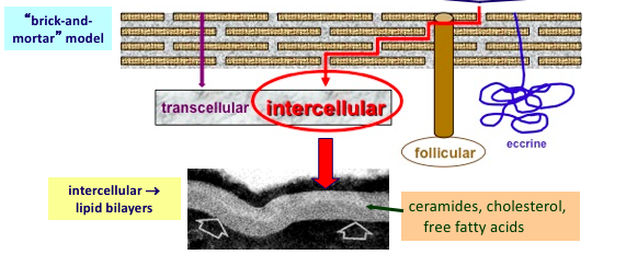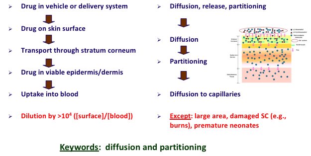 The drug is placed on the skin and moves through the SC via intercellular transport. It is then uptaken into the blood via passive diffusion