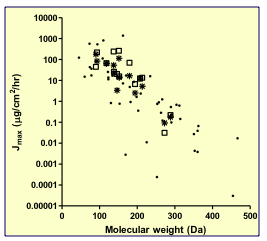 What will increase/decrease the max flux of a drug across the stratum corneum?