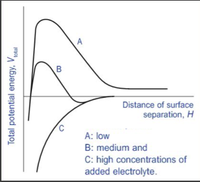 Low conc –> No secondary minimum is formed, which is needed for pharmaceutical suspensions. But a large primary maximum