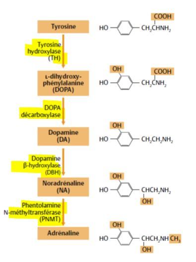 Ex: les neurone dopaminergiques possèdent les enzymes qui transforment la tyrosine en DA, mais pas l’enzyme qui transforme la DA en NA (voir image)