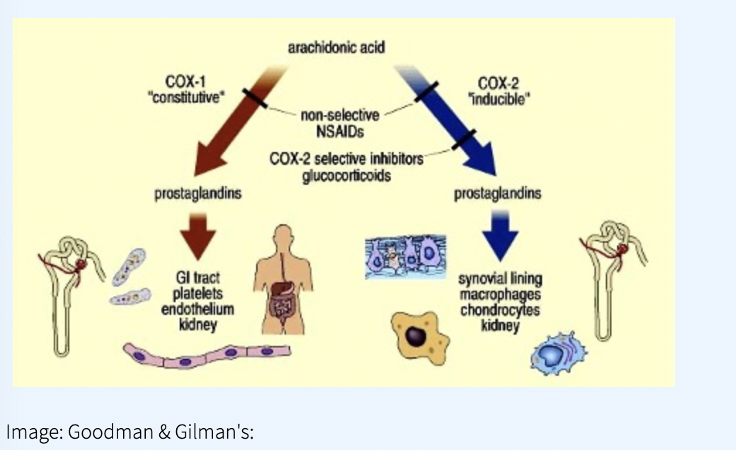 * La COX-1 est présente dans la plupart des tissus et fait la régulation des processus cellulaires normaux (et bénéfiques) comme la gastroprotection, l’homéostasie vasculaire, l’agrégation plaquettaire et la fonction rénale.