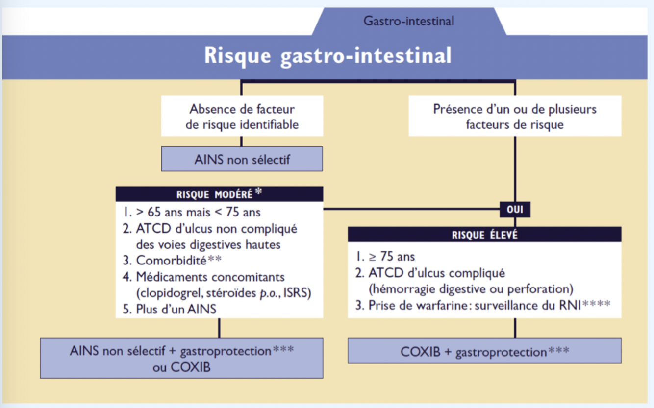 Le risque de complications gastro-intestinales croît avec l’augmentation du nombre de facteurs de risque. Le nombre de facteurs justifiant l’ajout d’une gastroprotection repose sur le jugement du clinicien.