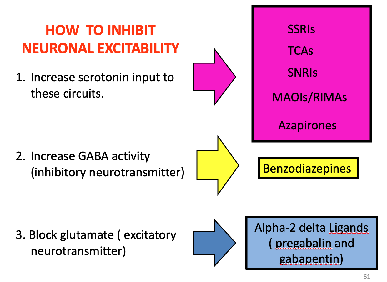 Nommez 3 mécanismes pharmacologiques pour inhiber l’excitabilité neuronale causée par l’anxiété par les neurotransmetteurs