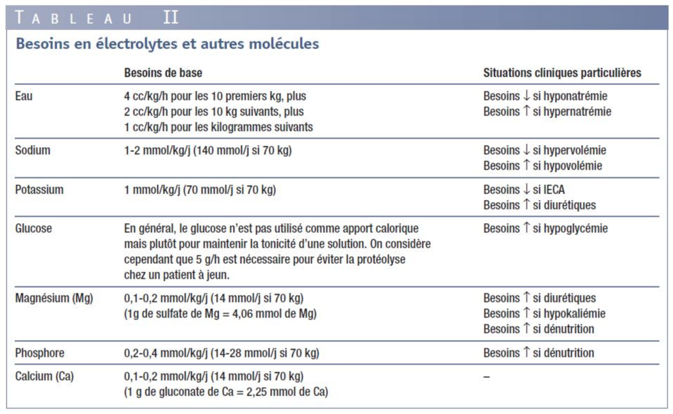 Un jeune de 16 ans a subi un accident de motocross. L’évaluation clinique démontre une fracture déplacée du plateau tibial gauche. L’hémodynamie est normale et le patient est gardé à jeun en prévision d’une réduction ouverte. La chirurgie est prévue aussitôt que le bloc opératoire sera libre. Après avoir immobilisé la fracture et soulagé le patient, vous désirez installer un soluté D5%NaCl 0,45% à débit d’entretien.