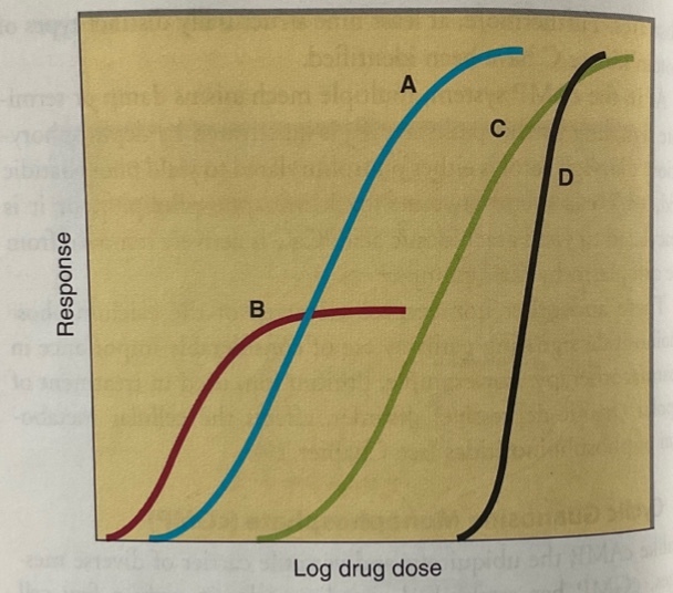 ◦ I.e. a drug is potent if not much of it is needed to reach maximum effect even where another drug may have a higher maximum effect in large concentrations ◦ So drug B is more POTENT than drug A —> ◦ Dependent on ‣ Kd - affinity of receptors for binding the drug ‣ EFificency in which drug receptor binding is coupled to response