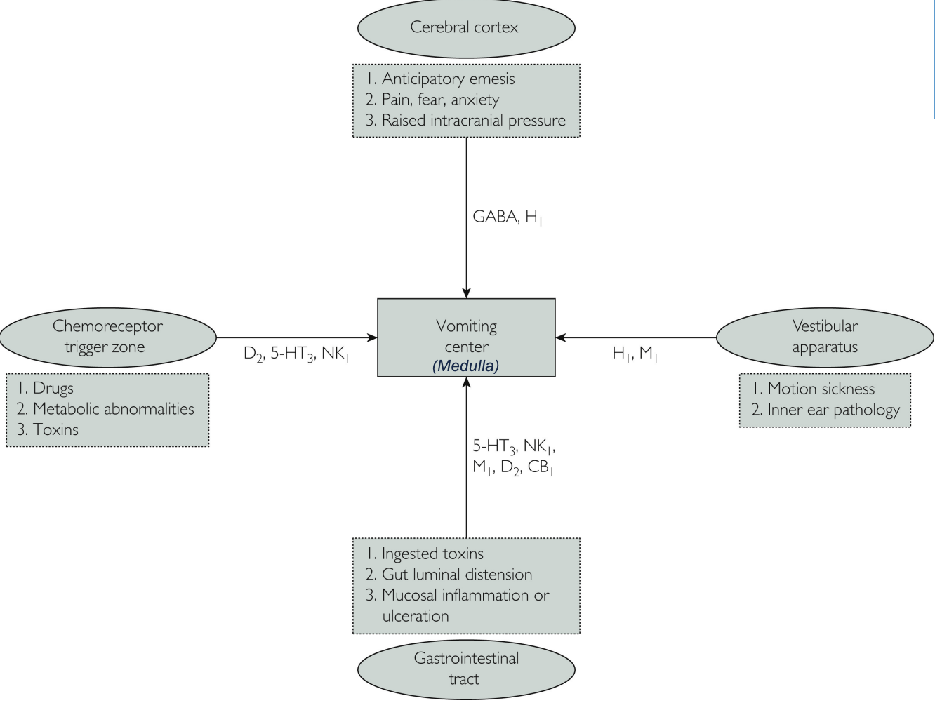 Multiple inputs can send signals to the area postrema region in the medulla that triggers nausea and vomiting