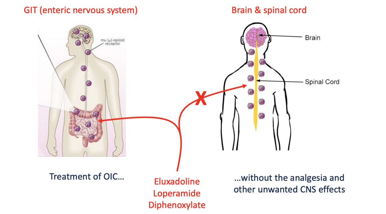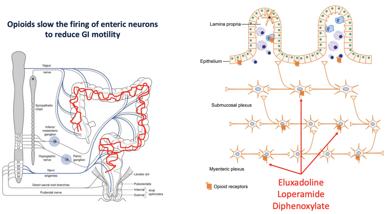 Opiods slow the firing of enteric neurons to reduce GI motility