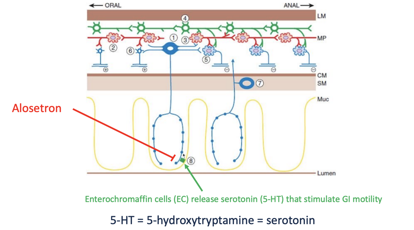 Alosetron blocks enterochromaffin cells from releasing 5-HT which normally stimulates GI motility