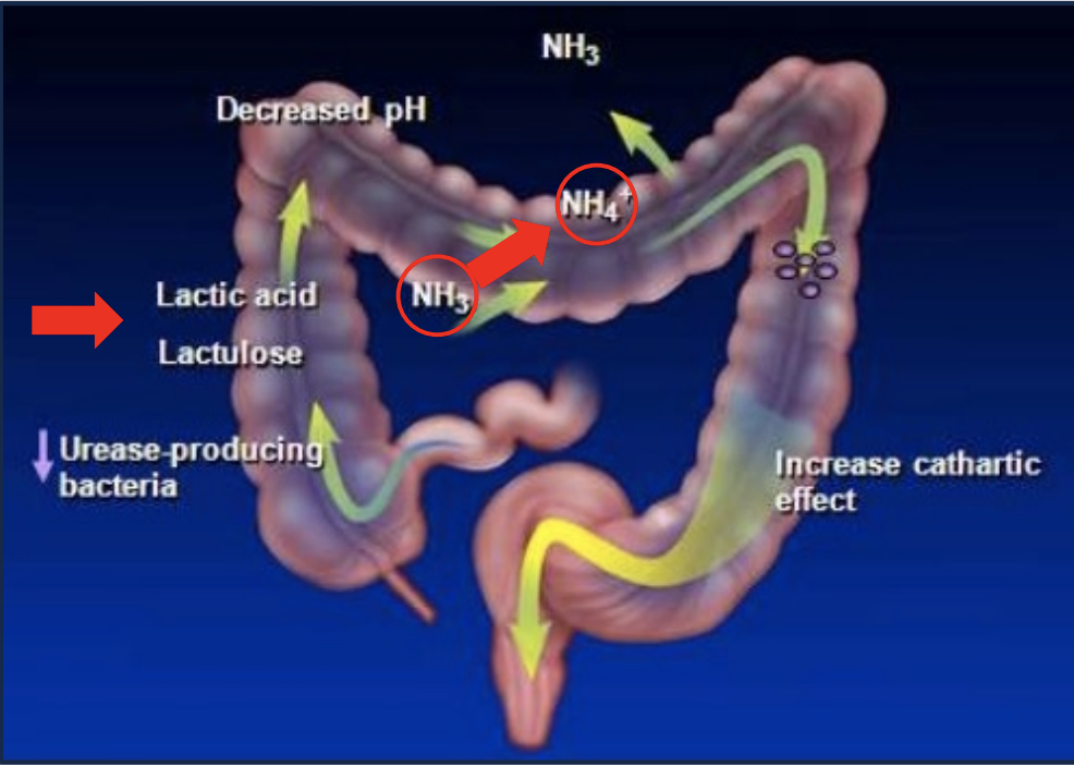 Lactulose acidifies the gut, converting NH3 –> NH4+ which is then non-absorbable