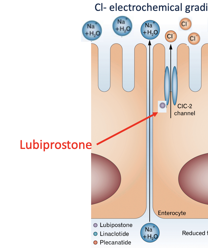 Lubiprostone is a laxative that activates Cl- channels to promote the movement of water into the colon