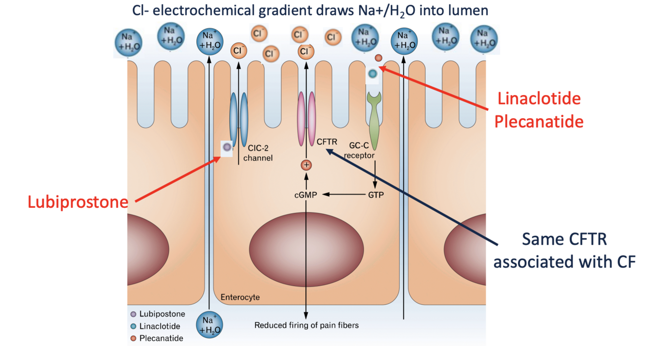 Linaclotide and Plecanatide are two guanylate cyclase agonists which work by increasing cGMP and stimulating the CFTR receptor in the gut