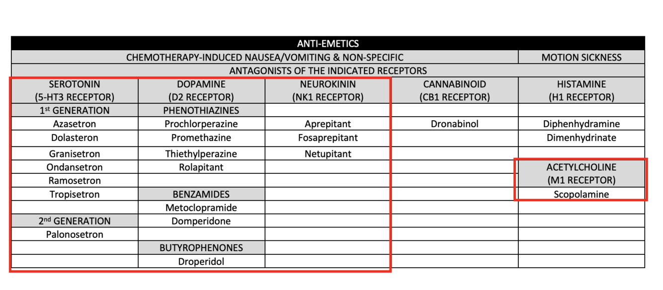 Scopalamine is an anti-emetic which blocks M1 receptors