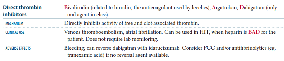 *Direct thrombin inhibitors; used when heparin is BAD for the pt
