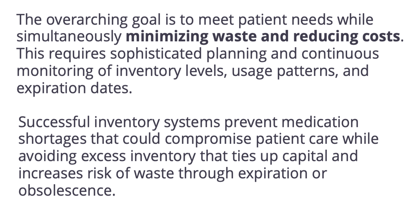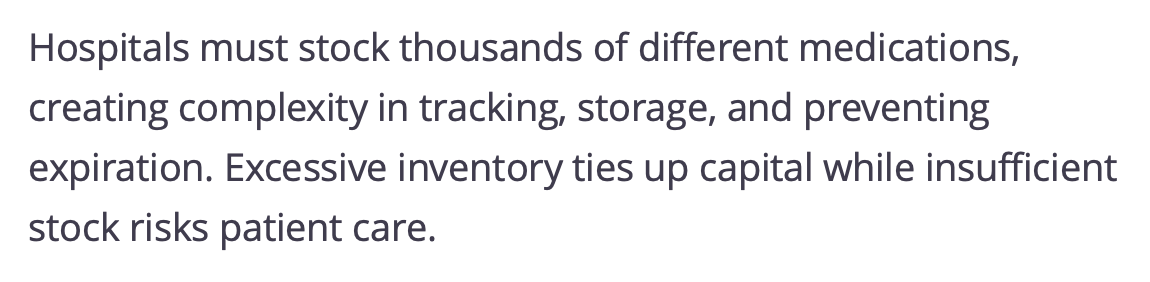 hospitals risk stockouts that delay treatment, overstocking that increases waste and expired medications, and poor financial performance due to inefficient resource allocation