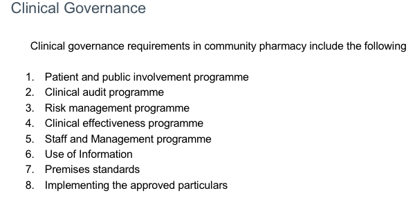 What are the requirments of clinical governance in community pharmacy?