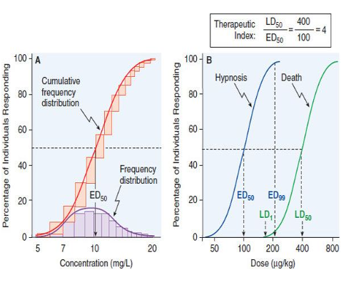 When drugs TD50/ED50 <10 we say that the drug has a “narrow” therapeutic index - there is a small variation in drug dosage that causes desired effect vs. harmful effects