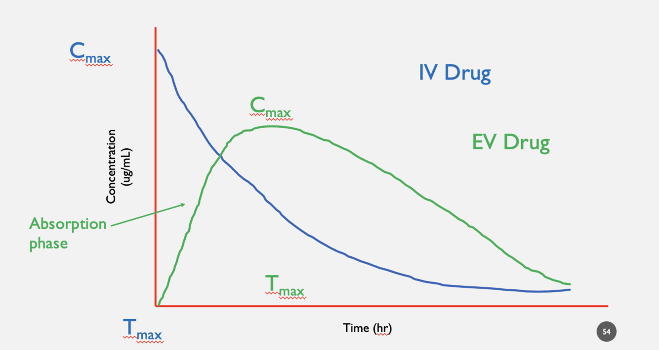 drug injected into bloodstream- skips absoptive phase (100% absorption)