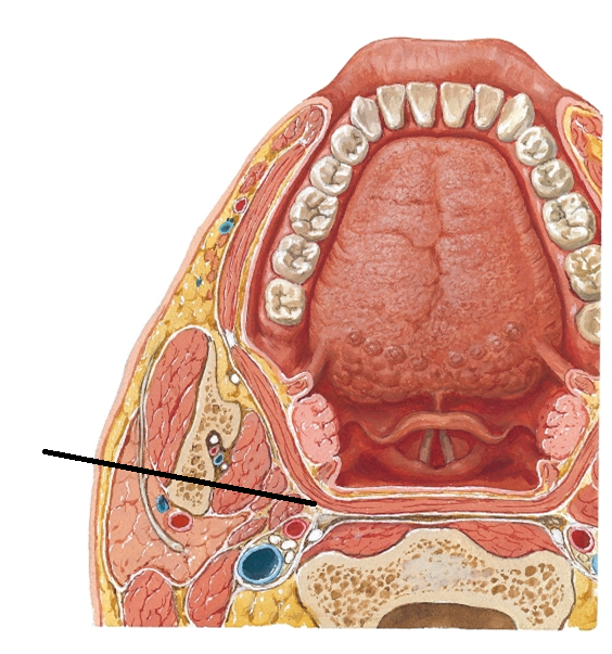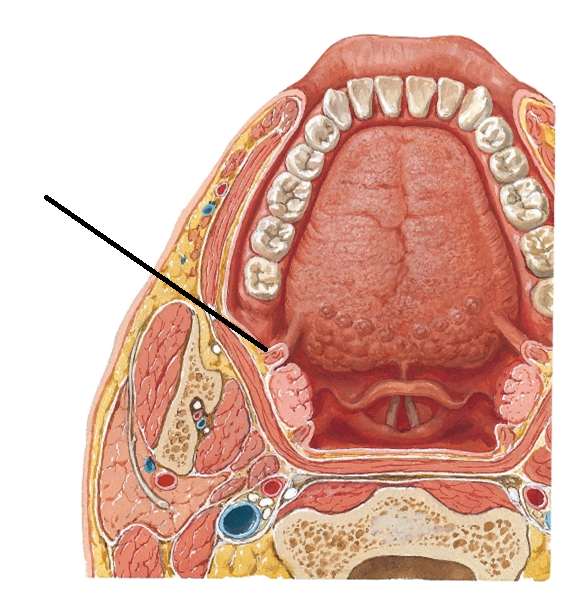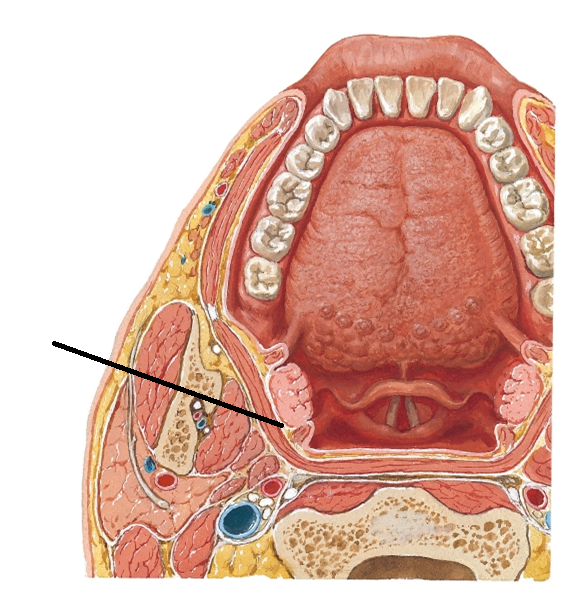 Middle portion of the pharynx; posterior to the mouth