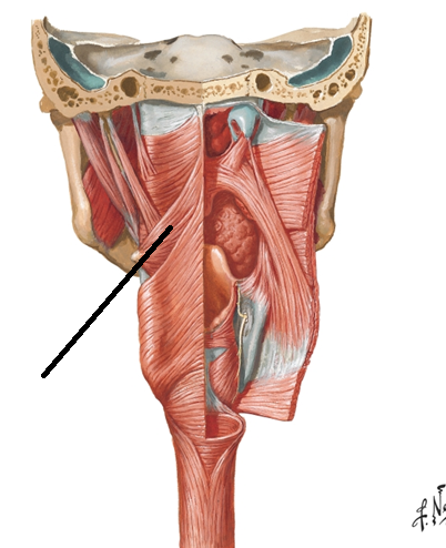 Largest of the three constrictor muscles; Originates from the pterygoid hamulus, pterygomandibular raphe and mandible. It has an additional attachment at the pharyngeal tubercle of the occipital bone. Innervated by the pharyngeal plexus