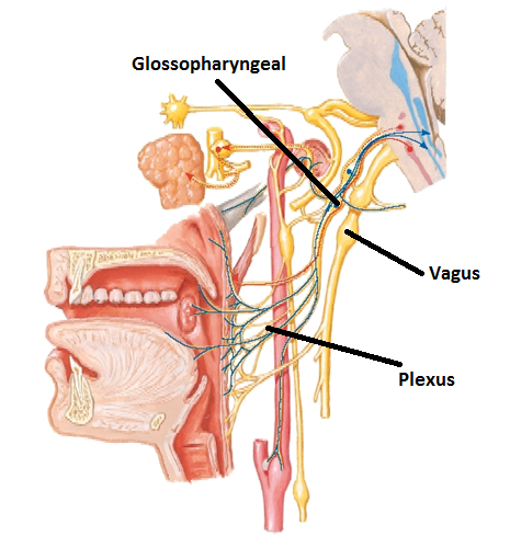 The plexus receives nerve fibers from CN IX, X and XI, and sympathetic nerves