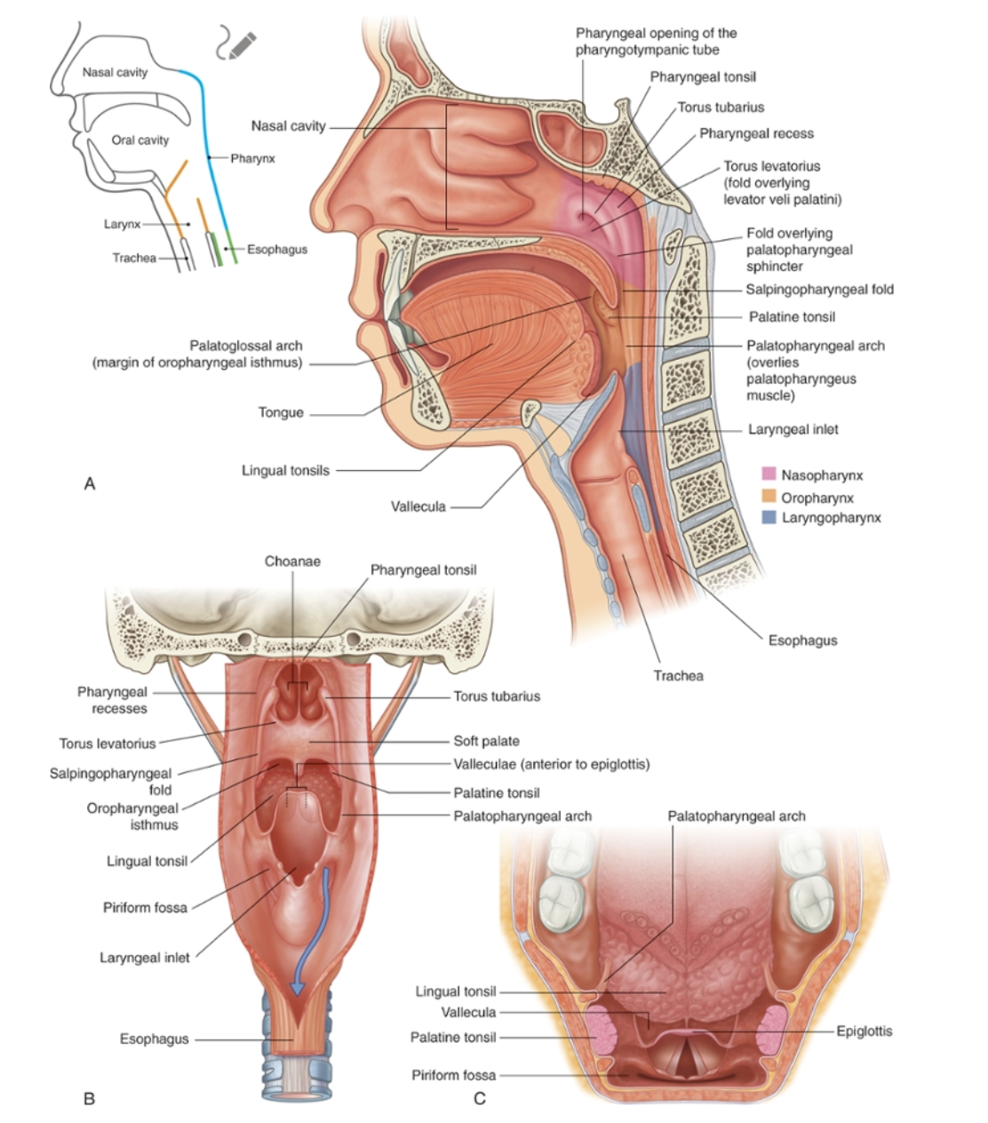 Drains into deep cervical nodes and include retropharyngeal (between nasopharynx and vertebral column), paratracheal and infrahyoid nodes
