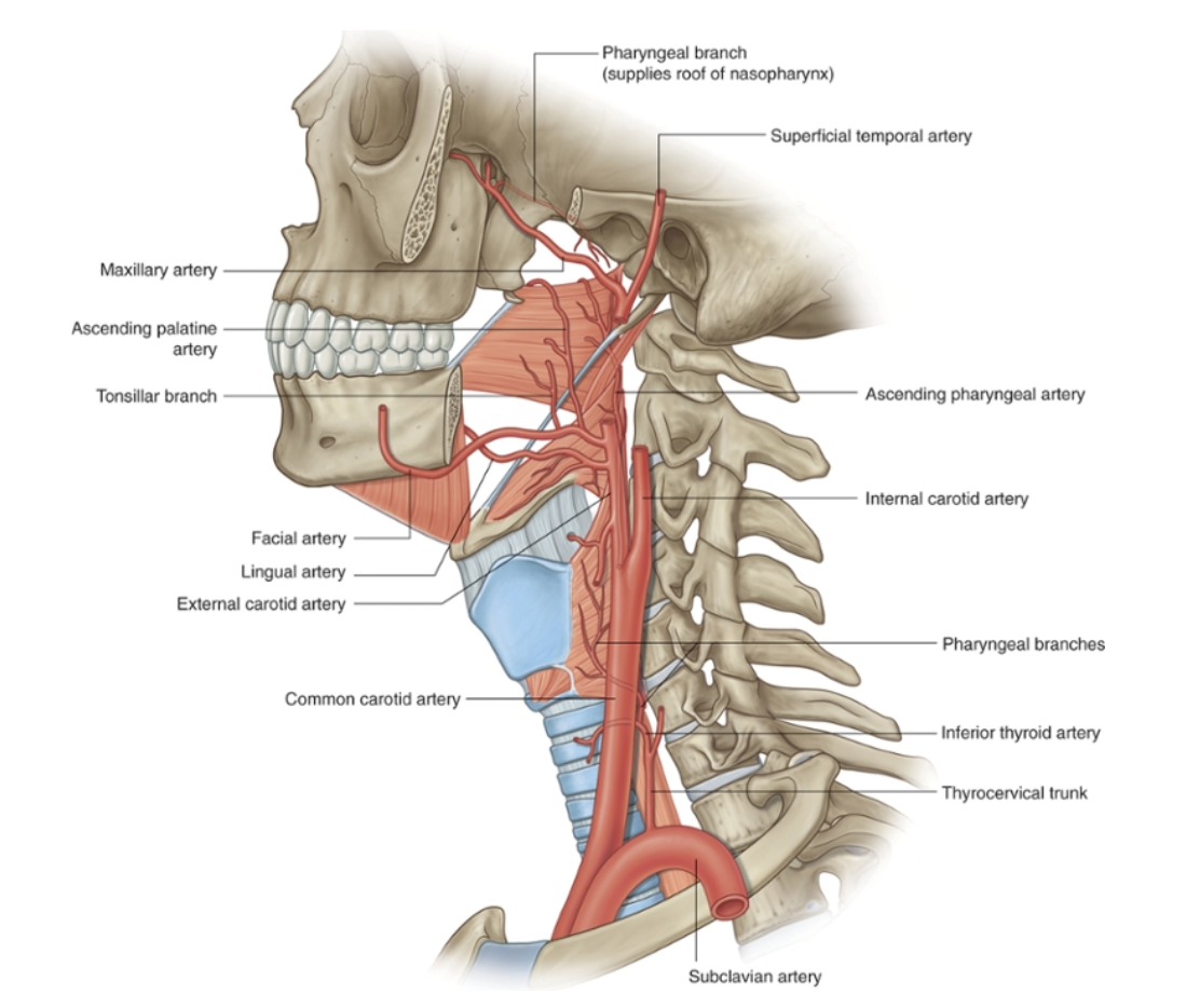 Tonsillar branch of the facial artery (which penetrates the superior constrictor muscle)