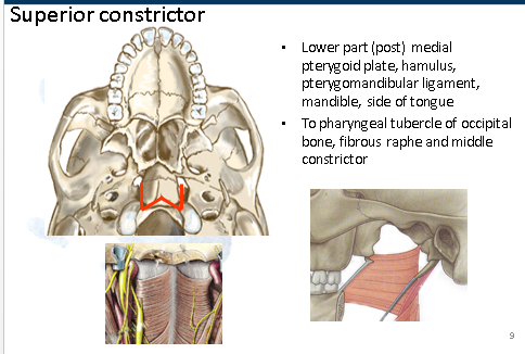 To pharyngeal tubercle of occipital bone, fibrous raphe and middle constrictor