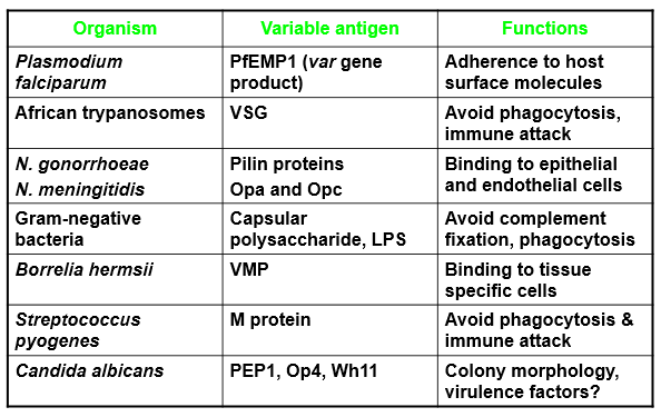 Pathogens have variable antigens, most of them are imvolved in adherence and host-pathogen interactions between ligands and receptors. This is due to the importance of host-pathogen interactions in pathogenesis. This can also be to avoid immune defenses such as macrophage phagocytosis.