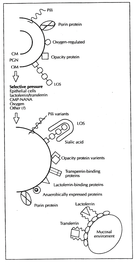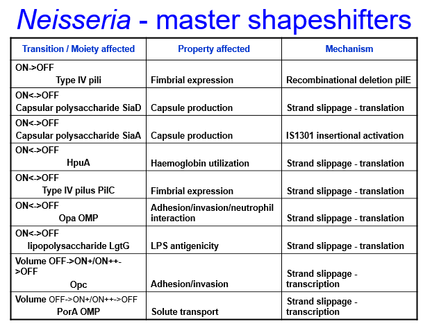 Opacity proteins are adhesins, particularly to epithelia. Neisseria has up to 11, which can be switched on/off in different combinations to evade immune response. They can be recombined (recombination). No more than one gene can be switched on at any one time as they all have the same promoter (cassettes). Each gene is controlled independently by translational frameshifting.