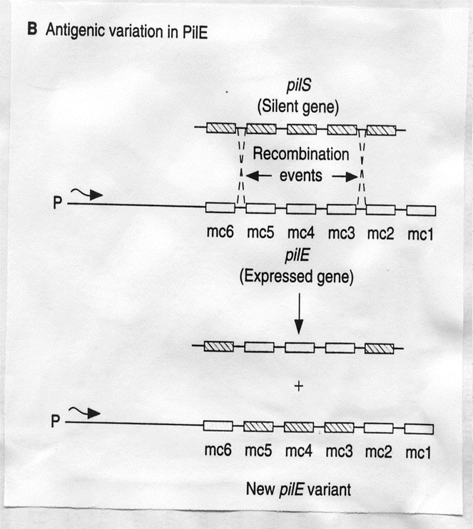 Pilin proteins of Neisseria form pili of bacteria, which are encoded by PilE genes. Sometimes recombination between PilE and PilS genes from silent to expression sites. PilS does not have a promoter and is silent, so silences expression. Each gene contains mini-casettes, which can be subjected to recombination events. New PilE variants can be made. This can affect the pathogenesis and virulence of the bacteria.
